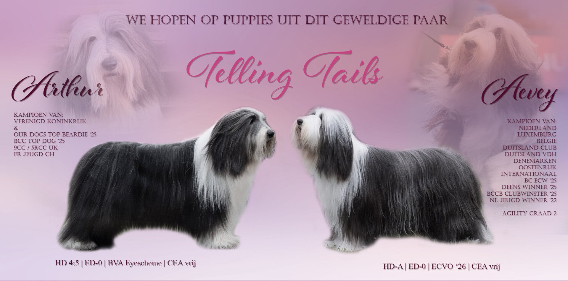 Dit speciale nestje van Aevey en Arthur biedt de kans om een pup te verwelkomen die voortkomt uit een lijn van prachtige, gezonde en liefdevolle Bearded Collies. Ze dragen de erfenis van 25 jaar passie voor het ras met zich mee. Wij nodigen u van harte uit om contact met ons op te nemen en deel uit te maken van dit bijzondere verhaal.